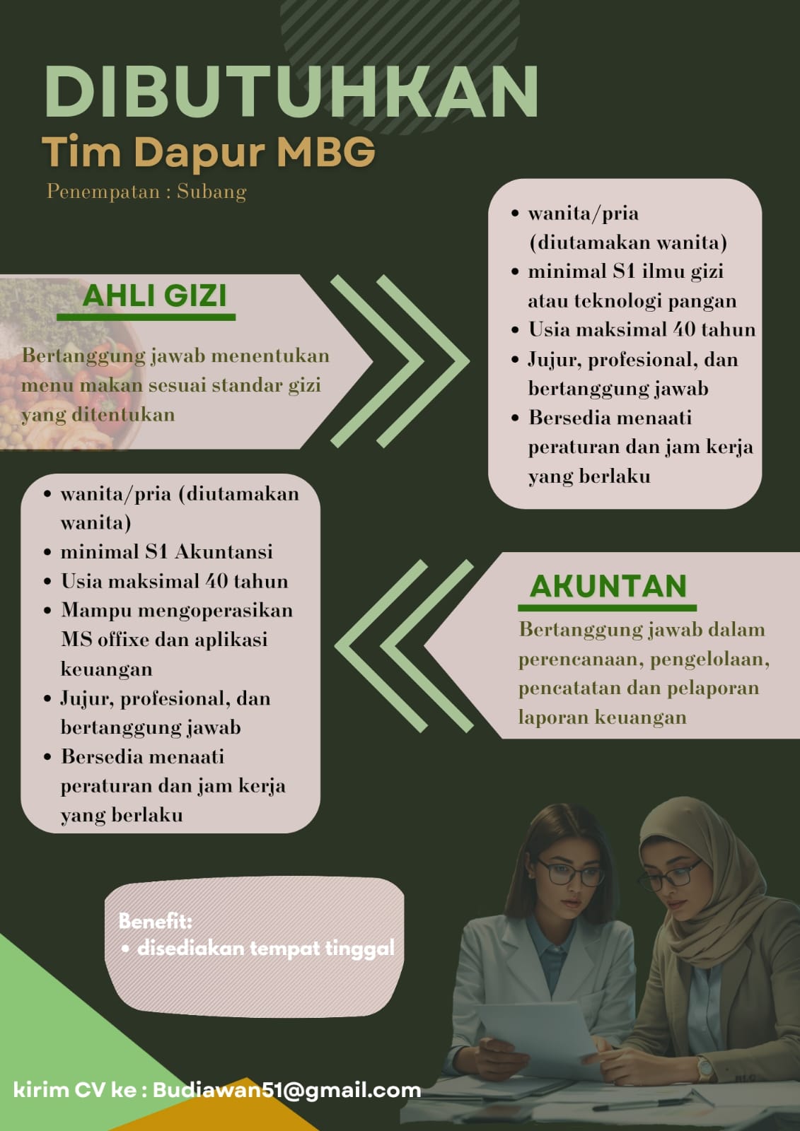 Tim Dapur MBG membuka lowongan untuk posisi Ahli Gizi dan Akuntan dengan penempatan di Subang. Disediakan tempat tinggal sebagai benefit.